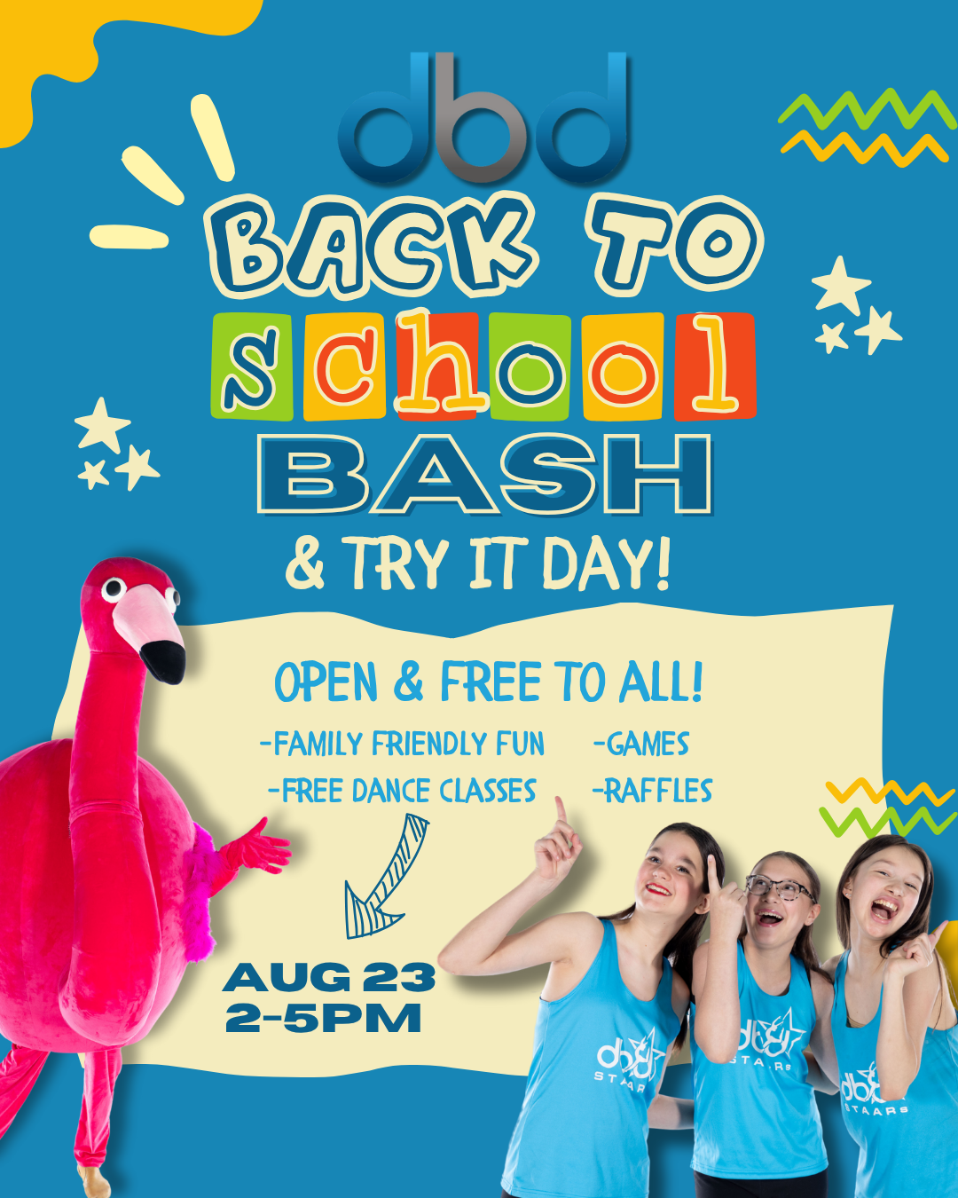Dancers are invited to try our studio classes for FREE ages 1-adult. Come early or stick around after your free classes to enjoy our Back to School Bash!!